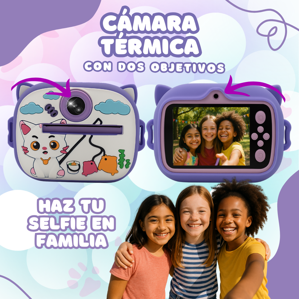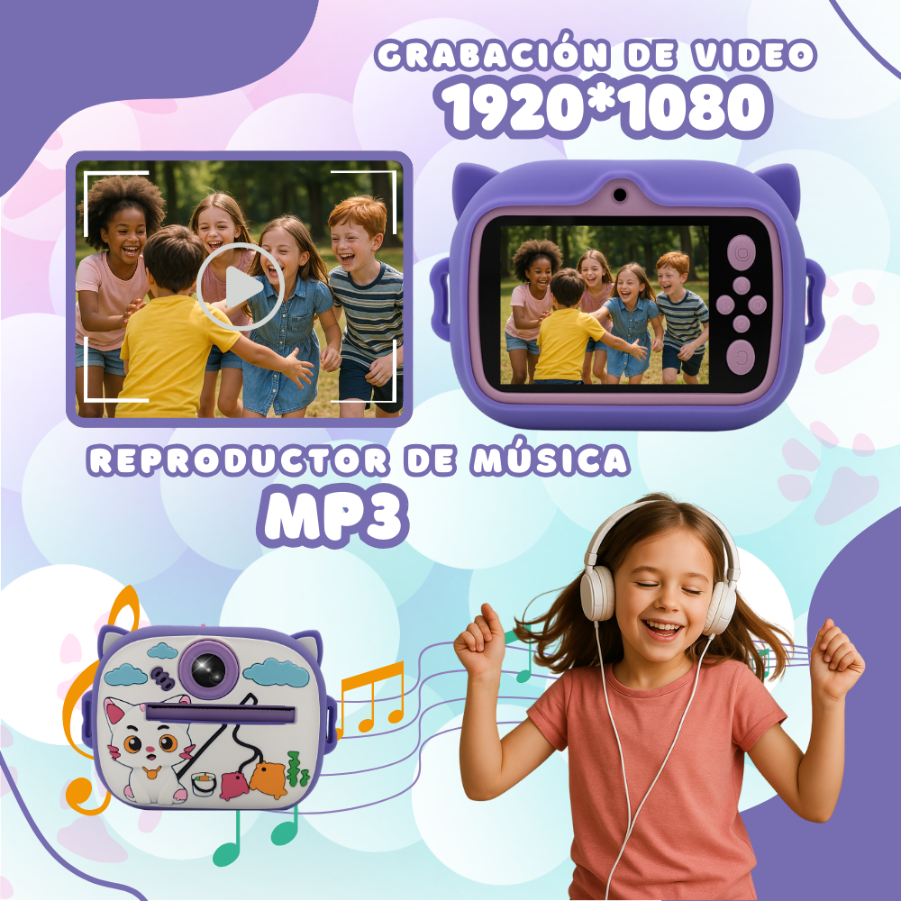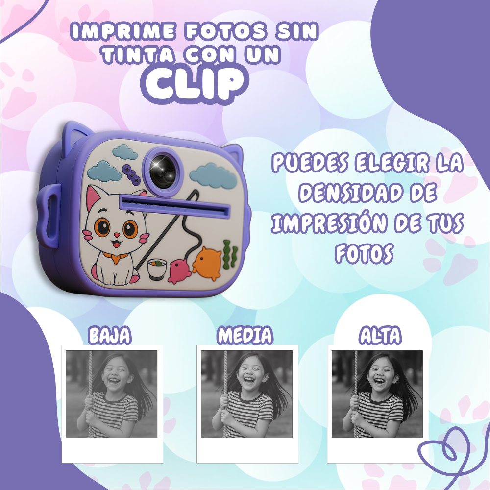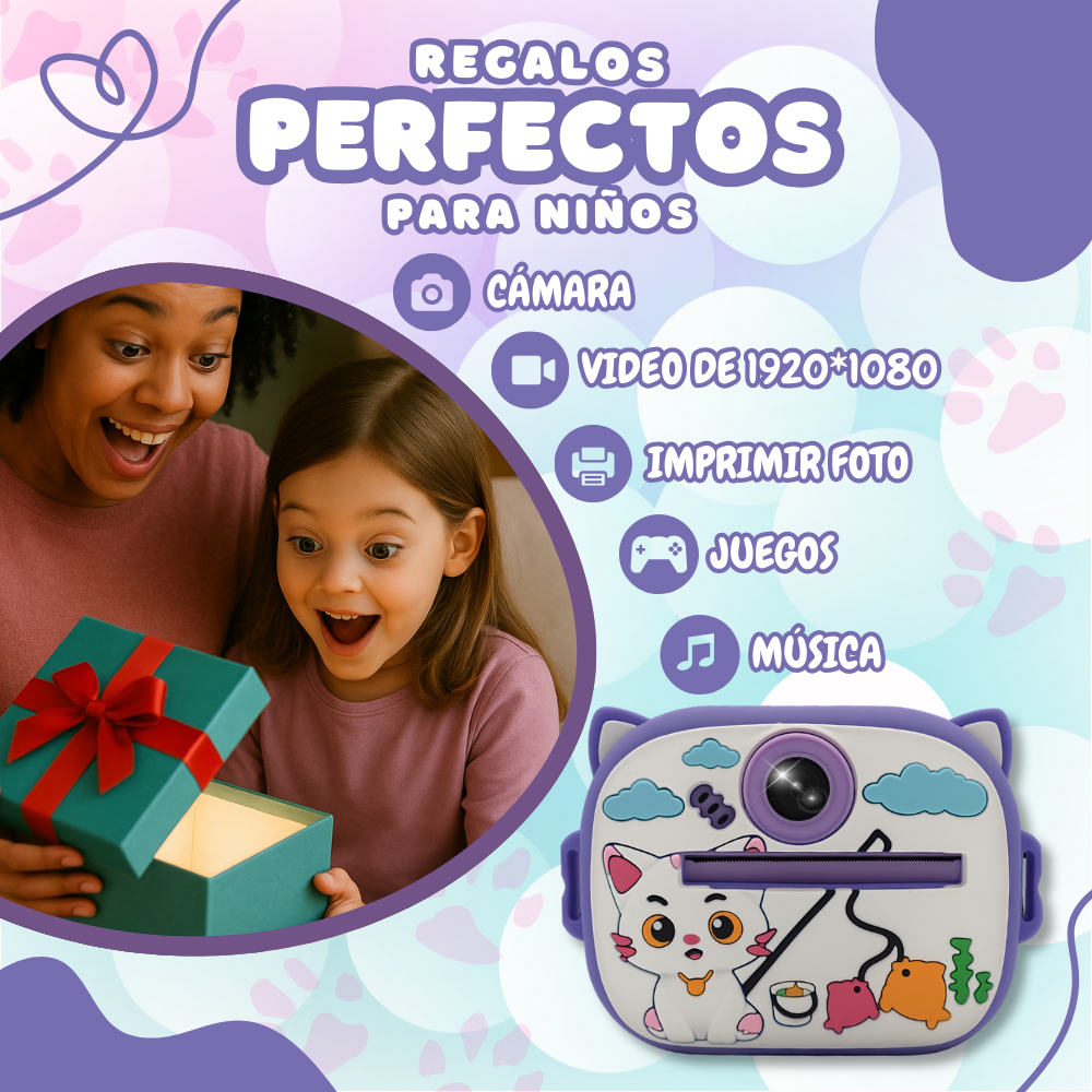 La Cámara Instantánea Infantil es ideal para que los niños capturen y creen recuerdos de forma divertida. Cuenta con una pantalla IPS de 2 pulgadas y ofrece funciones como tomar fotos, grabar videos, disparo continuo, reproductor MP3, enfoque inteligente y marcos decorativos.