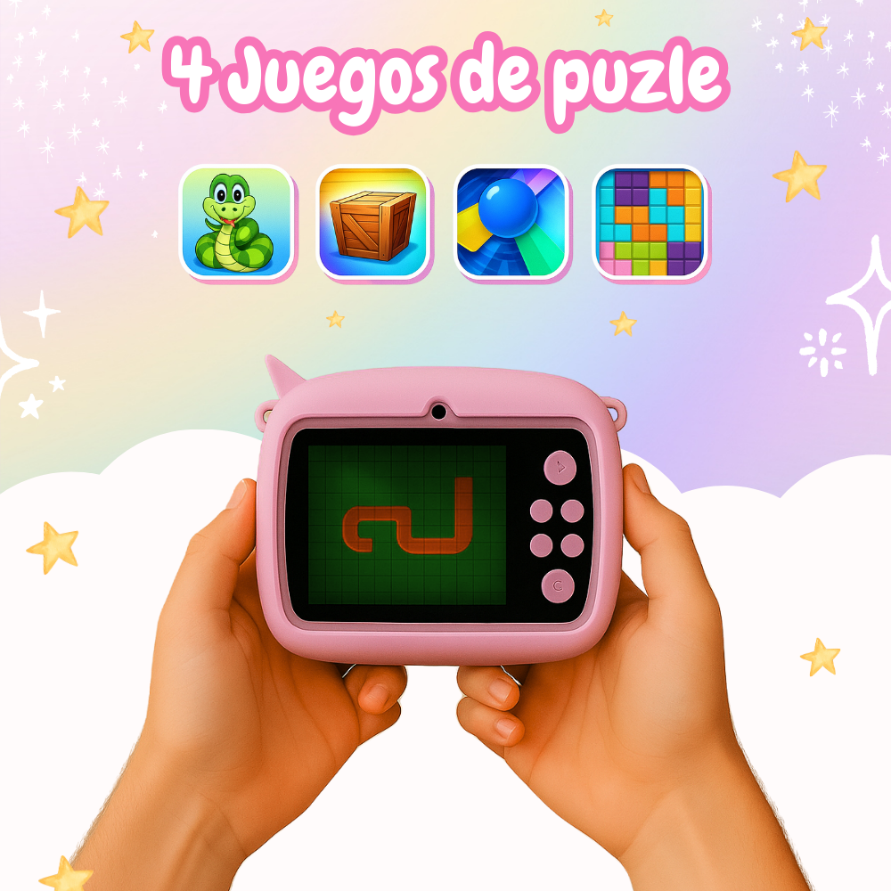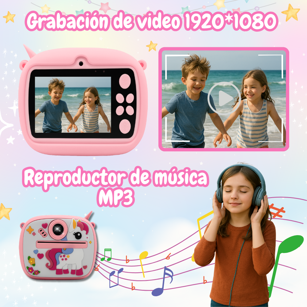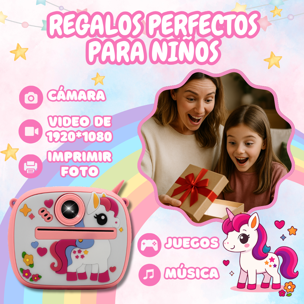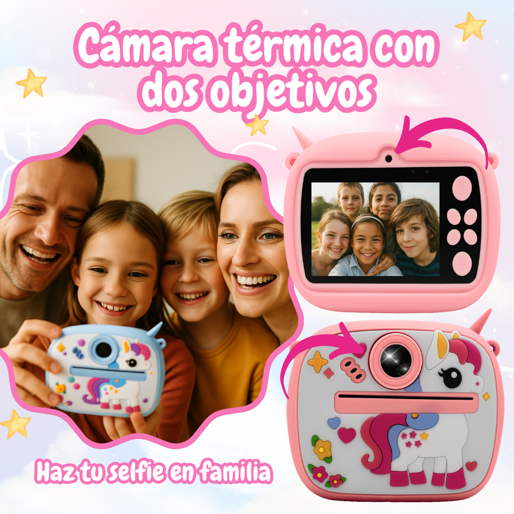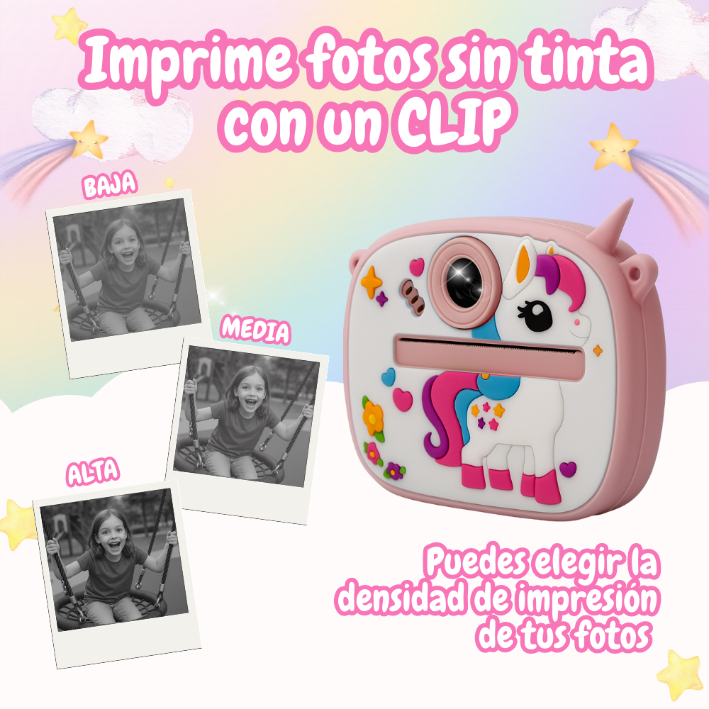 La Cámara Instantánea Infantil es ideal para que los niños capturen y creen recuerdos de forma divertida. Cuenta con una pantalla IPS de 2 pulgadas y ofrece funciones como tomar fotos, grabar videos, disparo continuo, reproductor MP3, enfoque inteligente y marcos decorativos.